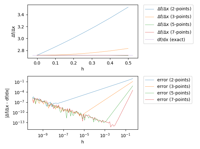 Ndiv: h Df/Dx(2-point) Df/Dx(3-point) Df/Dx(5-point) Df/Dx(7-point)